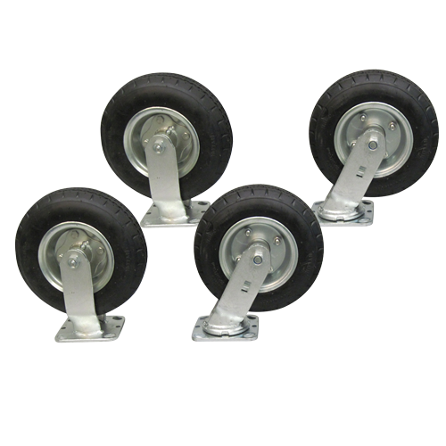 8" x 3" full pneumatic casters on steel rigs, two rigid, two swivel.